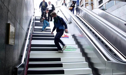 In een metrostation in Stockholm werd een gewone trap omgebouwd tot een pianoklavier. Elke trede maakte een geluid wanneer je erop stapte. Het gevolg: veel meer mensen kozen spontaan de trap in plaats van de roltrap.